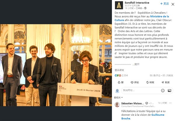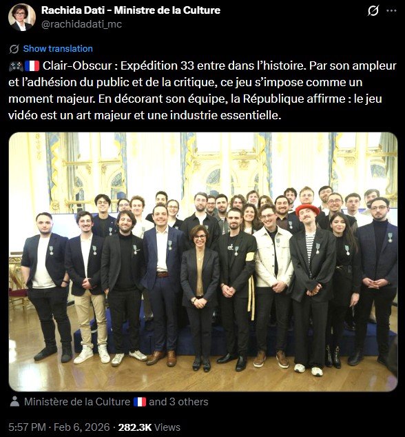 游戏开发单位Sandfall Interactive因畅销游戏《光与影:33号远征队》获颁法国文化部艺术与文学勋章,法国文化部长拉希达·达蒂(前排C位者)在授勋仪式上宣布:“借由此次授勋,我国主张电子游戏不仅是主流艺术形式,而且是一门支柱产业。”