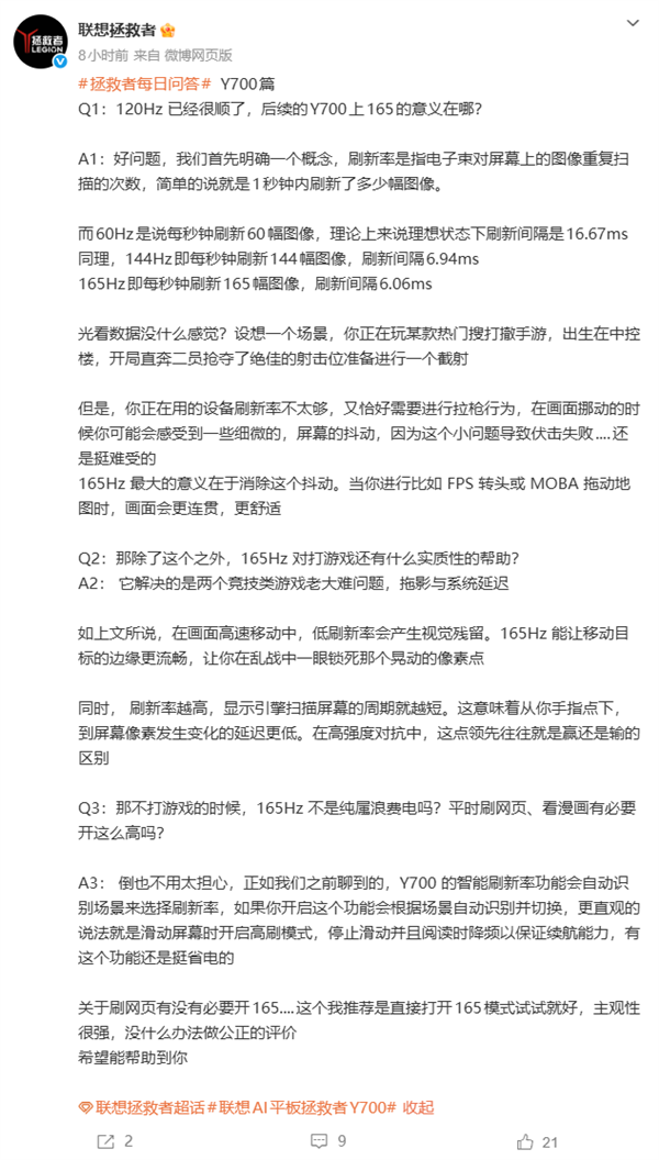 今日,联想拯救者官微发文,对Y700配备165Hz超高刷屏的意义进行科普,直面玩家常见疑问:“120Hz已经很顺了,为什么还要上165Hz?”以及“165Hz对游戏究竟有什么实际帮助?”