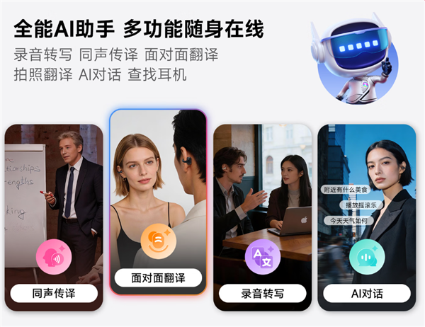 此外,耳机还内置全能AI助手,支持同声传译、录音转写、会议纪要等功能,搭配APP可实现听感校准、手势自定义等个性化设置。