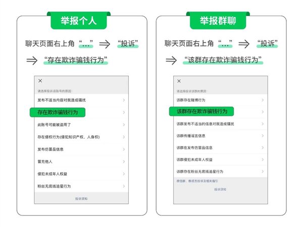 如果发现聊天的对方或者群聊存在欺诈骗钱等异常行为,立刻举报。