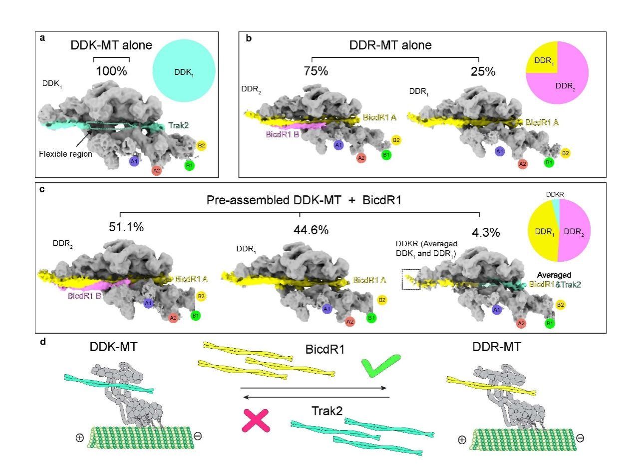图5:冷冻电镜结果直接“看到”不同亲和力的adaptors可以直接在预组装的DD-MT复合物内部直接竞争交换,与生化结果相互印证。研究人员进一步进行了冷冻电镜(cryo-EM)分析,以定量观察微管上adaptor竞争置换过程中的结构变化。结果与凝胶实验的观察高度一致。研究首先获得了微管结合态的DDK和DDR复合物并对两种不同亲和力的DDA复合物进行结构比较。在预组装DDK–微管复合物后,加入BicDR1所获得的结构,很明显,大多数复合物已经转变为DDR,仅有少数例外仍保留为DDK。和凝胶结果一致,反过来用DDK来竞争已经形成好的DDR则不行。