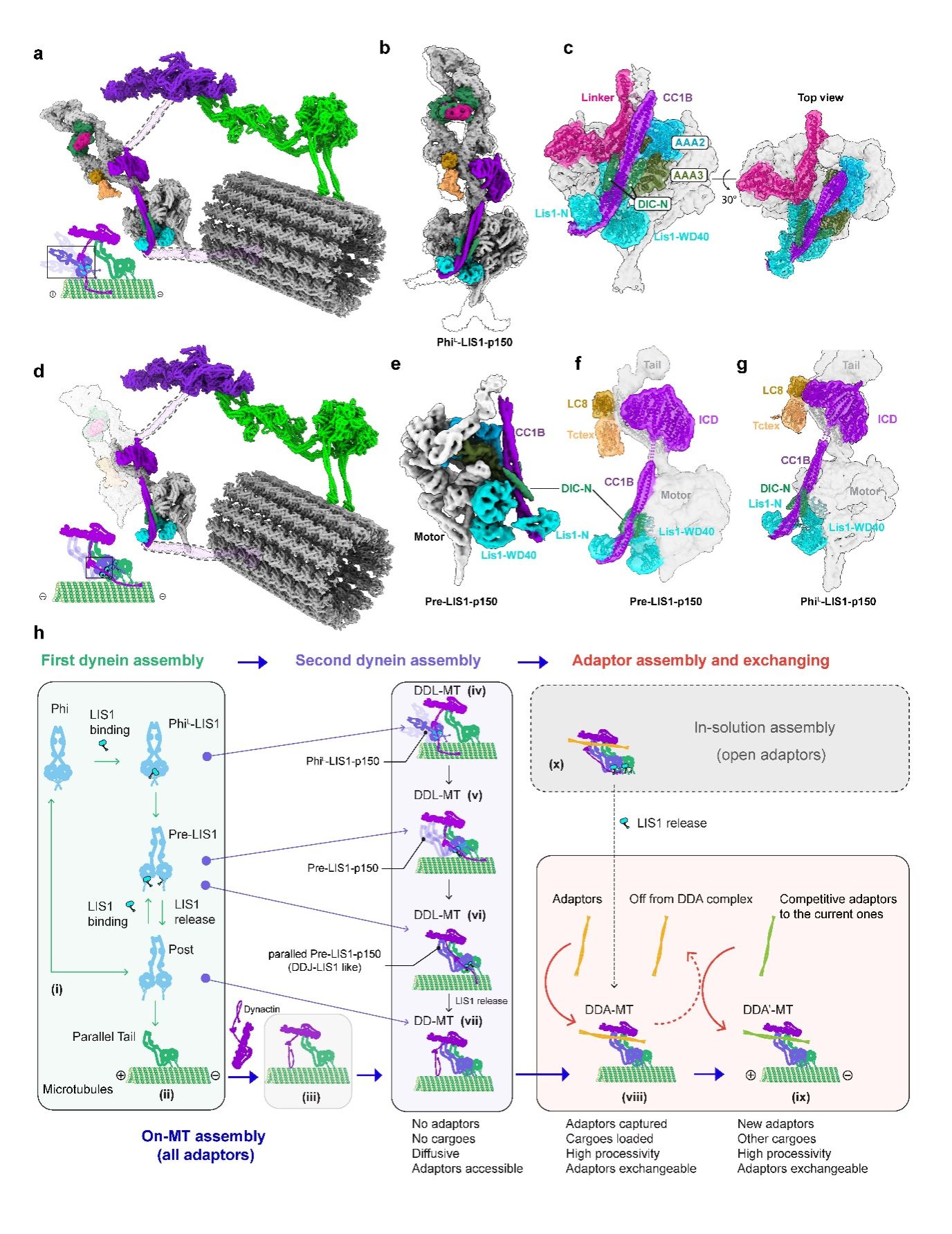 图3:DDA组装复合体在微管上的模型图、不同状态的冷冻电镜检查,以及没有接头蛋白的情况下的DD-MT高分辨结构。接头蛋白的动态进入与交换