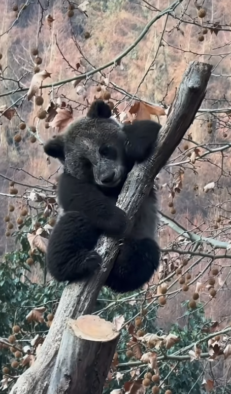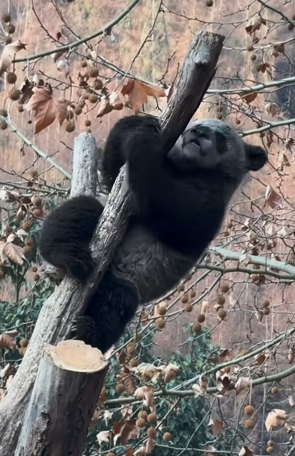 从网友发布的视频来看,苏锦崽趴在树枝上,原本应当黑白分明的毛色几乎“黑成一片”,连脸部的白色区域也被染得发暗。