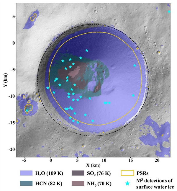 基于该模型对沙克尔顿区域开展了高空间分辨率的水冰热稳定性模拟,精准分析了当地的表面辐射、月壤温度,以及水冰稳定区域的分布特征,同时也探明了该区域水冰及HCN、SO₂、NH₃等其他挥发分的稳定区域分布规律。