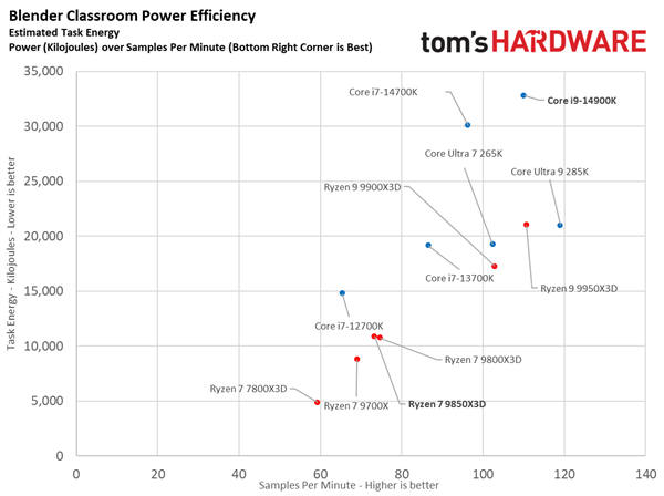 生产力功耗,AMD遥遥领先,7800X3D还不到90W,9850X3D也只有150W出头,14900K就超过了300W。