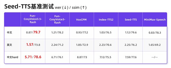 在Seed-TTS基准测试的中文“困难案例”指标中,Fun-CosyVoice3.5表现抢眼,词错误率(Word Error Rate,WER)和说话人相似度(Speaker Similarity,SSIM)均为最佳。