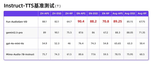 Fun-AudioGen-VD专注“从无到有”的音色设计。在指令遵循能力和可控性的Instruct-TTS基准测试中超过gemini2.5-pro和gpt-4o-mini-tts。