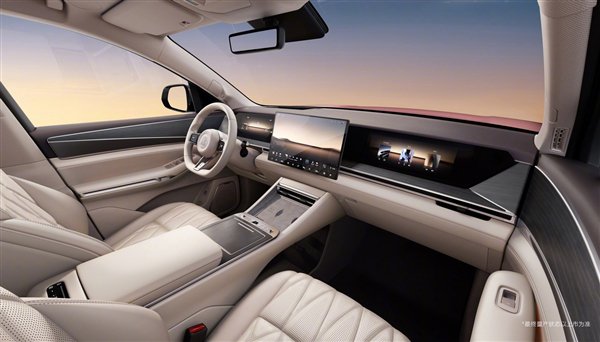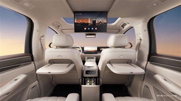 配置方面,该车启用全新的三屏设计,包括全液晶仪表屏、悬浮式中控屏和副驾娱乐屏,同时提供抬头显示,中控台下方是无线充电面板,并保留快捷物理按键,后面是木质纹理的杯槽遮盖,还配有后排娱乐吸顶屏、双小桌板以及小冰箱,主打家庭用车场景。