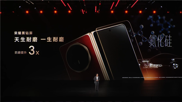 针对折叠屏用户普遍担心的屏幕易刮花、易碎以及强光反射严重等行业痛点,荣耀Magic V6带来了全新至臻黑钻屏,主打抗刮、低反、耐磨三大特性,实现“告别贴膜、不怕强光”。