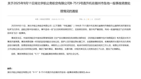 快科技3月13日消息,近日,中国民用航空中南地区管理局发布《关于2025年9月11日湖北宇航公务航空有限公司B-7515号直升机在随州市坠地一般事故调查处理情况的通报》。