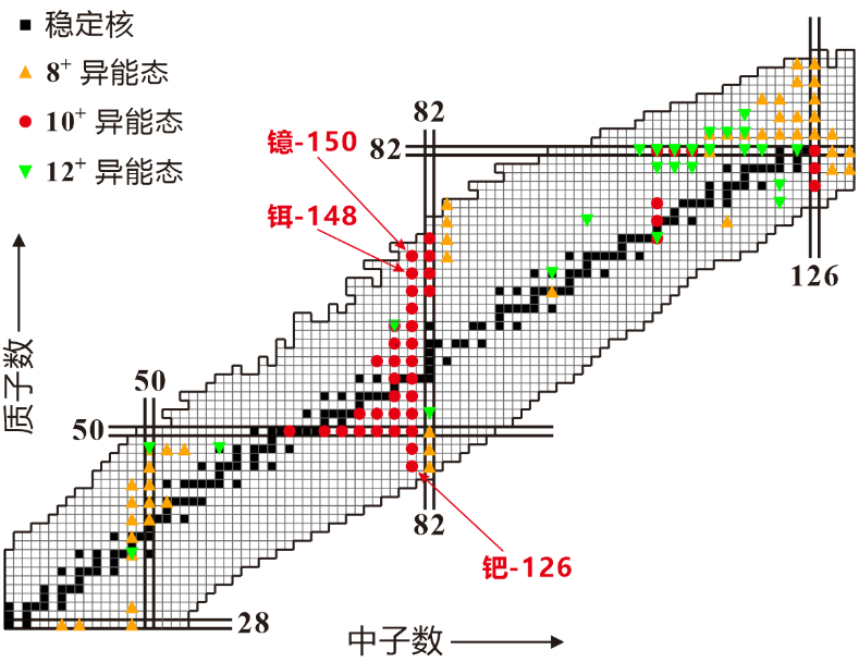 在中子数为80的偶偶核中存在一条引人注目的同核异能态链,自旋宇称为10+的异能态在十二个偶偶核(从丰中子核钯-126至缺中子核铒-148)中连续出现,形成了核素图上最长的10+同核异能态链。自1982年在铒-148中发现10+同核异能态以来,实验上一直没有观测到下一个同核异能态(镱-150)。该异能态链能否延续至质子滴线核区,成为四十多年来的未解之谜。