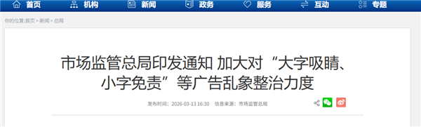 快科技3月13日消息,据国家市场监督管理总局网站消息,今日,市场监管总局印发《关于强化广告中提示性用语监管工作的通知》(以下简称《通知》),部署对相关广告乱象开展为期半年的清理整治工作。