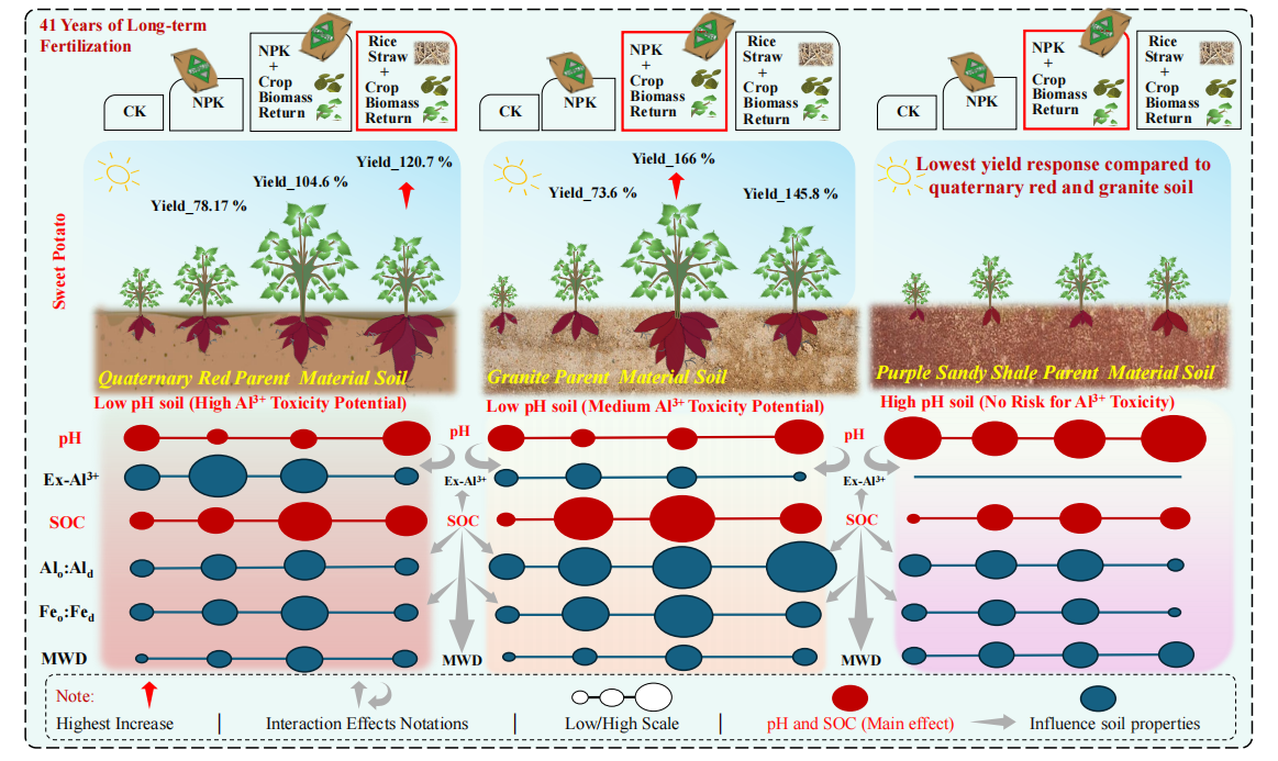 研究发现在初始偏酸的第四纪红土和花岗岩土壤上,相较不还田处理,秸秆还田显著提高土壤有机碳含量和团聚体稳定性,缓解由长期施化肥造成的酸化,降低交换性铝含量,进而使甘薯增产120%—166%;而紫色砂页岩土壤并未因长期施肥而酸化,秸秆还田对土壤有机碳含量、结构和作物产量的改善幅度较小。