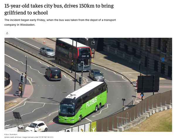 快科技3月16日消息,日前,德国黑森州威斯巴登市发生一起令人啼笑皆非的盗窃事件 —— 一名15岁少年为送14岁女友上学,竟然偷走一辆城市公交车。