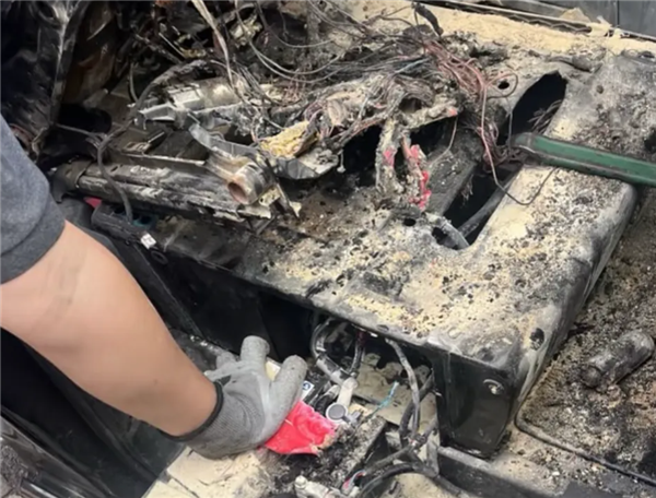 事故造成车辆副驾驶区域及内饰严重烧毁,中控、线路、座椅等部件大面积过火过水,车辆基本报废。