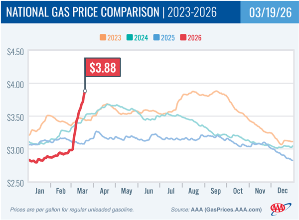 随着美国和以色列对伊朗的袭击点燃战火,美国汽油价格也踏上了“狂飙”之旅:本月月初至今,美国零售汽油平均价格已经累计飙升90美分/加仑,涨幅达到30%以上,如今已经逼近每加仑4美元。