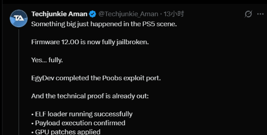 据称,开发者成功将Poobs内核漏洞移植至PS5 12.00系统,并与Luac0re/Mast1c0re用户层漏洞形成完整利用链。目前已实现:ELF加载器成功运行、Payload(载荷)执行已确认、GPU补丁应用、安全防护被绕过。