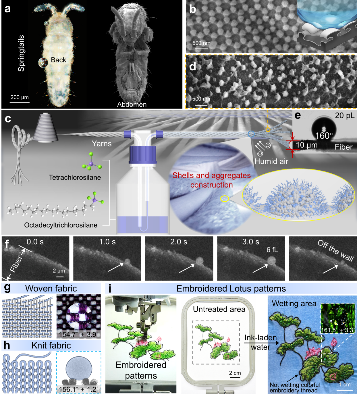 针对这一痛点,团队将目光投向一种生活在潮湿泥土中的微小生物——弹尾虫。这种经过约4亿年演化的小生物,体表拥有由微型蘑菇状结构和纳米级脊线组成的特殊表皮,犹如一件天然“防水盔甲”,使其能在水面跳跃而不被沾湿。