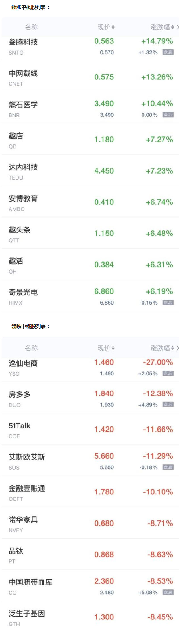 逸仙电商跌27%,51Talk跌超11%,涂鸦智能、小牛电动跌超5%,金山云、迅雷跌超4%,名创优品跌超3%,叮咚买菜跌近3%,每日优鲜、云米科技跌超2%,虎牙、斗鱼、腾讯ADR、欢聚集团、凤凰新媒体、陆金所控股、新氧跌超1%,开心汽车跌近1%。