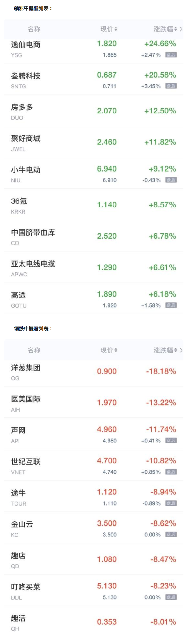 洋葱集团跌超18%,途牛跌近9%,金山云、叮咚买菜跌超8%,爱奇艺跌超7%,蘑菇街跌近7%,哔哩哔哩、斗鱼、贝壳跌超6%,达达集团、雾芯科技跌超5%,虎牙、欢聚集团、腾讯音乐、优信跌超4%,唯品会、一起教育跌近4%,云米科技、迅雷、汽车之家跌超3%,拼多多跌近3%,百度、新东方、老虎证券、搜狐、腾讯ADR、携程、涂鸦智能跌超2%,京东、BOSS直聘、网易有道、满帮、猎豹移动跌超1%,微美全息跌1%,开心汽车、名创优品跌近1%。