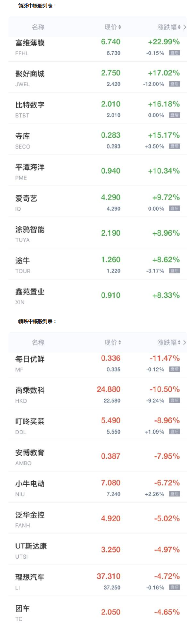 法拉第未来跌超17%,每日优鲜跌超11%,尚乘数科跌超10%,叮咚买菜跌近9%,小牛电动跌超6%,理想汽车跌超4%,蔚来汽车、小鹏汽车、乐居、猎豹移动、水滴公司跌超3%,开心汽车跌超2%,凤凰新媒体跌近2%,雾芯科技、趣头条跌超1%。