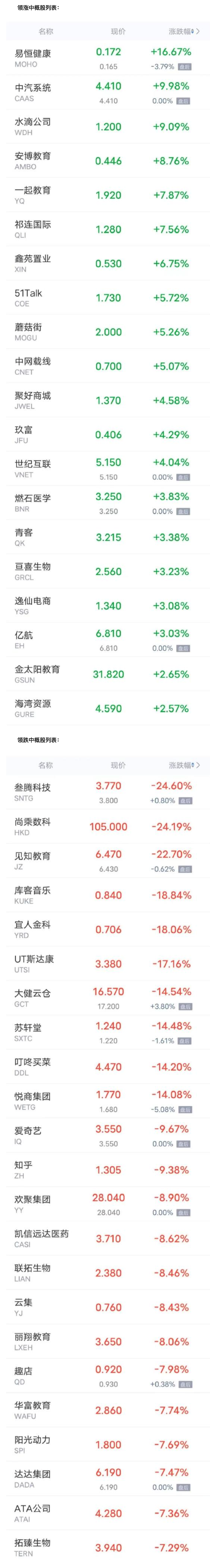 易恒健康涨超16%,中汽系统涨近10%,水滴公司涨超9%,安博教育涨超8%,一起教育涨近8%,祁连国际涨超7%,鑫苑置业涨超6%,51Talk、蘑菇街涨超5%,聚好商城、玖富、世纪互联涨超4%,燃石医学、青客、亘喜生物、逸仙电商、亿航涨超3%,金太阳教育、海湾资源、优克联、秦淮数据、嘉银金科、富维薄膜、信也科技涨超2%。天境生物涨超2%,新东方、陆金所、拼多多等小幅上涨。