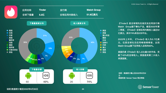 2022年上半年《Tinder》以5.7亿美元收入登顶全球社交应用畅销榜,截至2022年第二季度《Tinder》全球应用内购收入逼近52亿 美元。