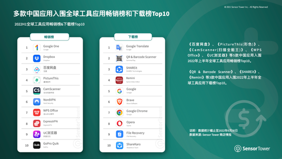 2022年上半年全球工具应用畅销榜和下载榜Top10中,共计有《PictureThis》、 《CamScanner》、《QR & Barcode Scanner》、《SHAREit》等8款中国工具应用入围。