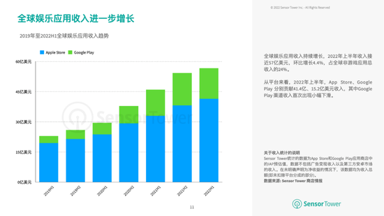 娱乐应用是主要的非游戏应用之一,近年来全球娱乐应用收入持续增⻓,2022年上半年实现近57亿美元收入,环比增⻓4.4%,其中Apple Store平台贡献了超过70%的收入。