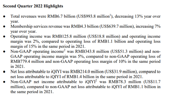 爱奇艺今年一季度首次盈利后,再一次实现单季盈利。