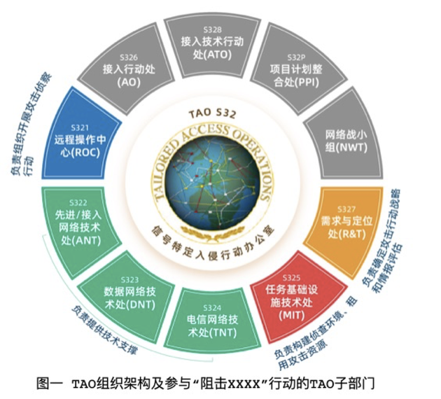 TAO成立于1998年,是目前美国政府专门从事对他国实施大规模网络攻击窃密活动的战术实施单位,由2000多名军人和文职人员组成,下设10个处室。