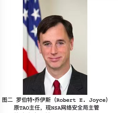 而当时TAO负责人是罗伯特·乔伊斯。此人1967年9月13日出生,曾就读于汉尼拔高中,1989年毕业于克拉克森大学,获学士学位,1993年毕业于约翰·霍普金斯大学,获硕士学位。1989年进入美国国家安全局工作。曾经担任过TAO副主任,2013年至2017年担任TAO主任。2017年10月开始担任代理美国国土安全顾问。2018年4月至5月,担任美国白宫国务安全顾问,后回到NSA担任美国国家安全局局长网络安全战略高级顾问,现担任NSA网络安全局主管。