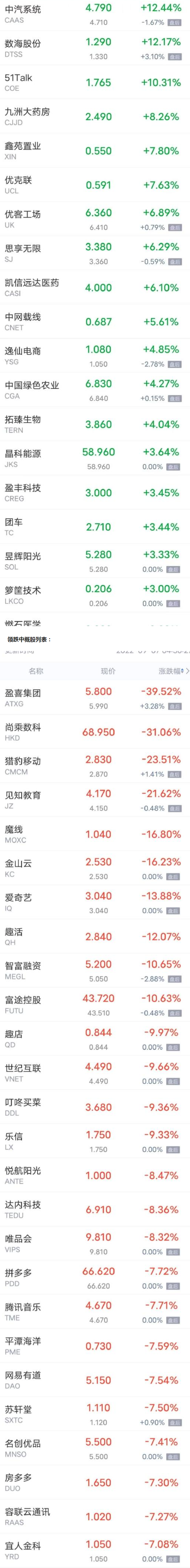 中汽系统、数海股份涨超12%,51Talk涨超10%,九洲大药房涨超8%,鑫苑置业涨超7%,思享无限、优客工场涨超6%,中网载线涨超5%,逸仙电商、中国绿色农业拓臻生物涨超4%、晶科能源、盈丰科技、团车、箩筐技术涨超3%,水滴公司、奥瑞金种业、贝壳等涨超2%。