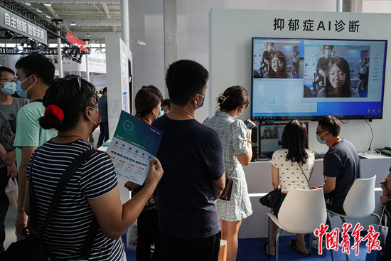 9月4日,2022年服贸会首钢园展区健康卫生服务专题展,参观者排队体验一款抑郁症AI诊断产品。据介绍,这款产品将人工智能微表情识别技术应用于抑郁症临床筛查中。