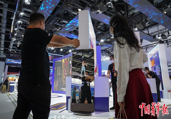9月5日,2022年服贸会国家会议中心展区,一名工作人员向参观者展示一款智能AI健身装置。