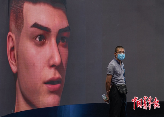 9月4日,2022年服贸会首钢园展区元宇宙体验馆,一名参观者身后的屏幕上显示着“数字人”的面孔。