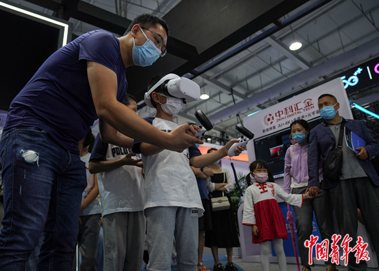 9月3日,2022年服贸会首钢园展区元宇宙体验馆,一个小朋友在工作人员的协助下体验VR游戏。