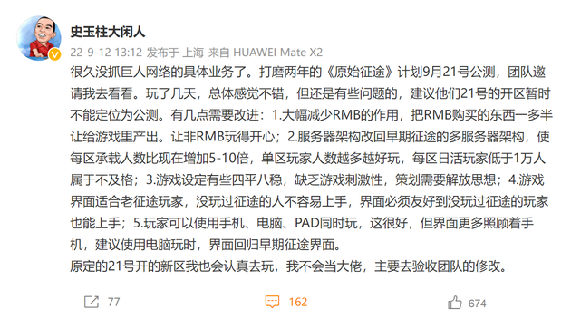 史玉柱昨日在社交媒体上发文,透露了他近期试玩《原始征途》公测版本的感受。这条几百字的微博,用了6个字来肯定研发团队的成果,用了300多字来提意见,以至于在内部看来这点“很史玉柱”。
