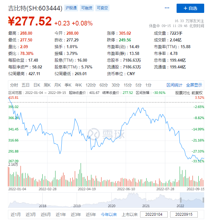 从二级市场的表现来看,《羊了个羊》的火爆似乎也未能带动吉比特股价的上涨,截至9月14日收盘,吉比特报收277.29元/股,跌0.41%。截至发稿,吉比特股价277.52元/股,小幅上涨。但Wind数据显示,今年以来,吉比特的股价累计跌幅超30%。