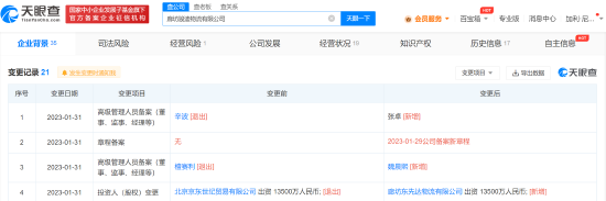天眼查App显示,近日,廊坊骏迪物流有限公司发生工商变更,原股东北京京东世纪贸易有限公司退出,新增廊坊东先达物流有限公司为股东并全资持股,后者系嘉实资本管理有限公司全资子公司。