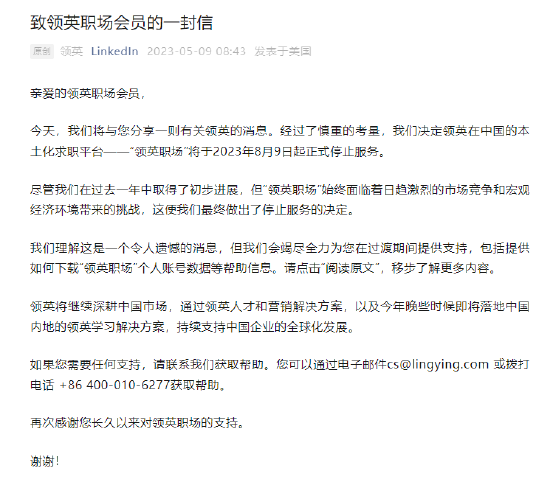 尽管我们在过去一年中取得了初步进展,但“领英职场”始终面临着日趋激烈的市场竞争和宏观经济环境带来的挑战,这使我们最终做出了停止服务的决定。