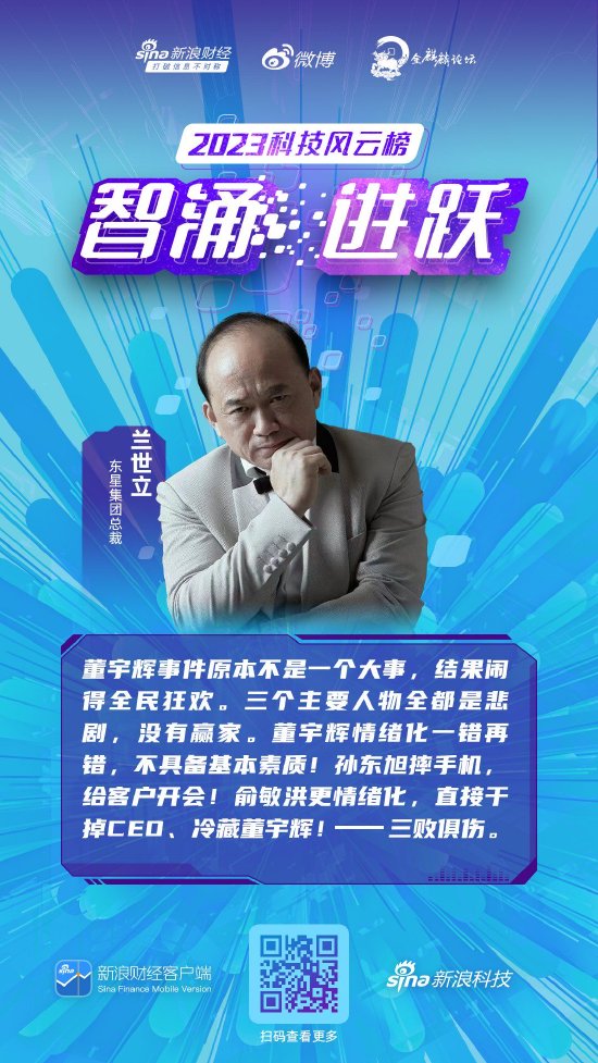 新浪科技讯 12月21日下午消息,由新浪财经客户端、新浪科技联合主办的“2023科技风云榜”年度盛典今日开幕,今年活动主题为“智涌·进跃”。在特别对话《时代风云》环节,东星集团总裁兰世立表示,董宇辉、东方甄选这件事情实质来讲是专业人士、企业的职业经理人和老板这三者之间的关系。这件本来就不是事的事,结果闹的全民狂欢,网络公司最开心了,经常有热搜话题。