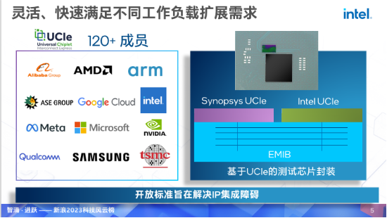 右边展示的图是最新的,在台积电N3E做出来的,他们通过一个嵌入式互联桥,以2.5D封装方式封装在一起来测试。这个目前也在快速进行中,这是我们未来能够解决多家不同的厂商,他们互联之间的障碍。