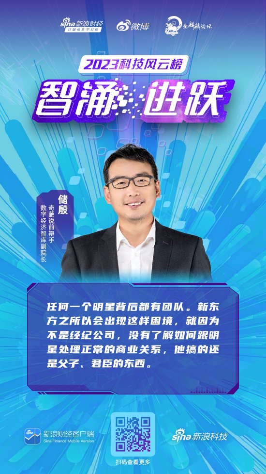 新浪科技讯 12月21日下午消息,由新浪财经客户端、新浪科技联合主办的“2023科技风云榜”年度盛典今日开幕,今年活动主题为“智涌·进跃”。在特别对话《时代风云》环节,奇葩说前辩手、财经领域博主储殷称,商业特别简单,是要根据不同的形式做出不同的安排,原来饿给点饭吃,现在好了还这样,这不行的。