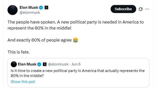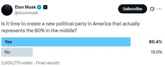 据了解,马斯克于5日首次提出这一想法。他在社交平台上向2.2亿粉丝发起投票,询问是否同意“是时候在美国创建一个真正代表80%中间派的新政党了”。