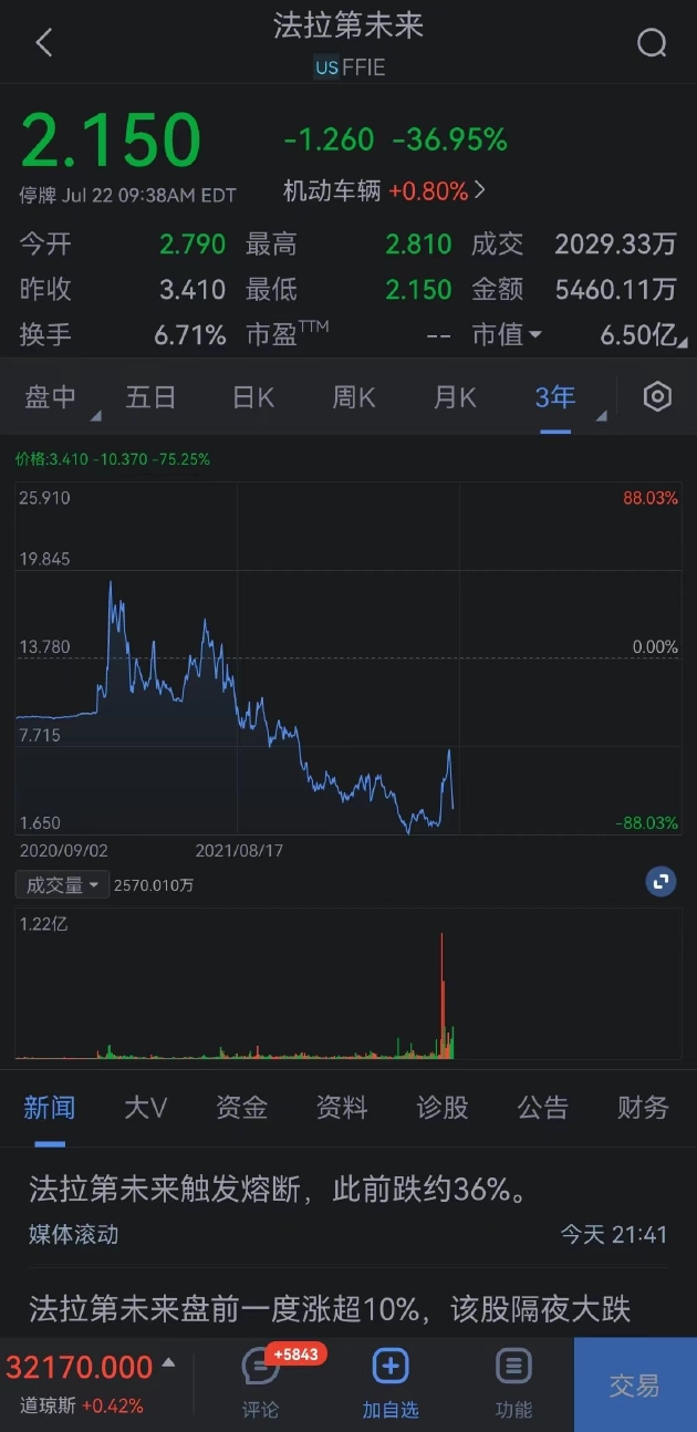 新浪科技讯 北京时间7月22日晚间消息,法拉第未来触发熔断,此前跌近37%。