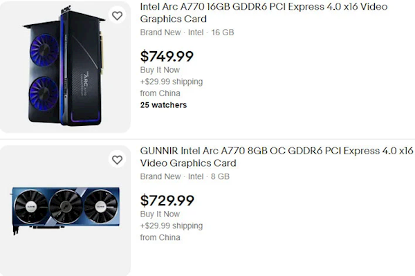 Intel官方给公版的建议零售价是289美元和349美元,然而,因为一卡难求,二手平台的黄牛给出的平均报价分别达到了430和750美元的价格。