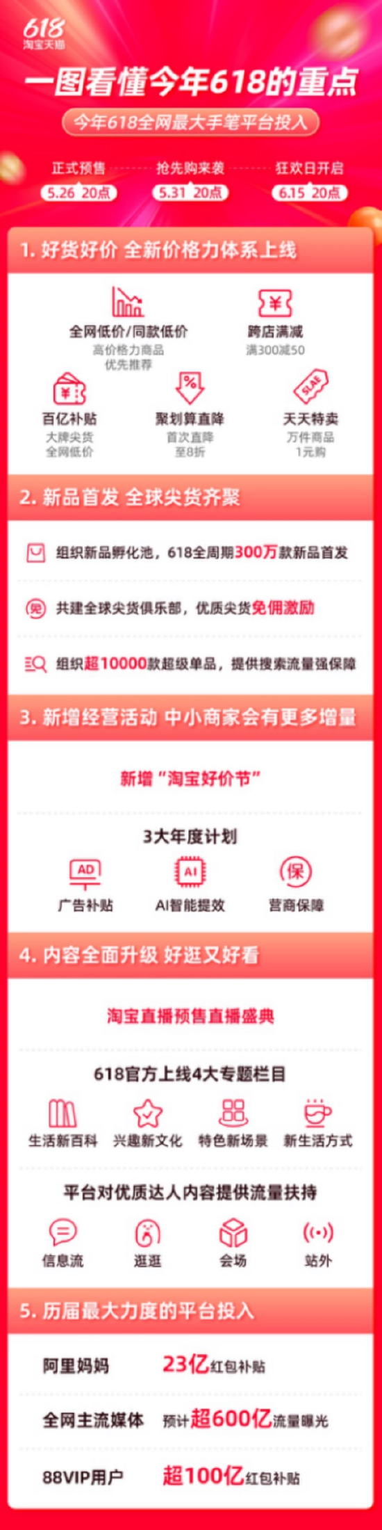 暮珊表示,今年淘宝天猫618是历史上最大投入的一届。淘宝天猫今年618全周期预计实现超600亿流量曝光,为商家引来海量顾客,同时阿里妈妈还提供总计23亿红包为超100万商家带来百亿流量支持。此外还有运费险折扣、供应链补贴、信用贷利率折扣、极速回款免手续费等降本举措。