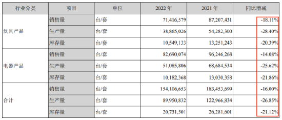 分业务来看,炊具和电器产品的产销量全线下滑。炊具主营业务全年实现收入61.2亿元,同比下降8.66%;电器主营业务实现收入138亿元,同比下降5.72%。