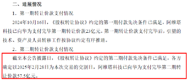 2月28日,长安汽车发布《关于联营企业对外投资的进展公告》。信息显示,阿维塔与华为《股权转让协议》约定的第二期付款先决条件已满足,阿维塔科技已于2025年2月28日向华为支付完毕第二期转让价款57.5亿元。第一期转让价款已于去年10月份完成,两期累计支付80.5亿元。公告还称,本次交割是阿维塔科技及长安汽车与华为引望长久战略合作的重要里程碑,标志着双方由最早开始的产业协同率先迈入以资本为纽带的新兴战略合作,这将持续助力阿维塔科技与长安汽车在汽车智能化领域加快构建领先竞争优势,助推阿维塔科技与长安汽车跨越式发展。